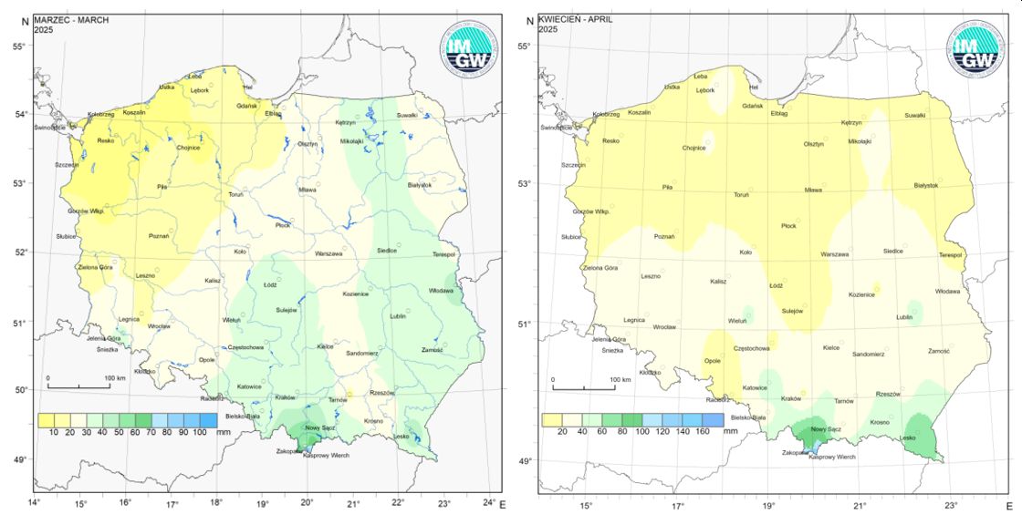 Ryc. 1. Miesięczne sumy opadów w marcu i kwietniu 2025 (źródło: IMiGW)