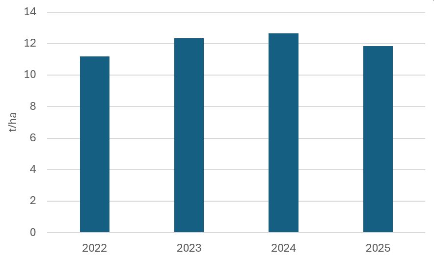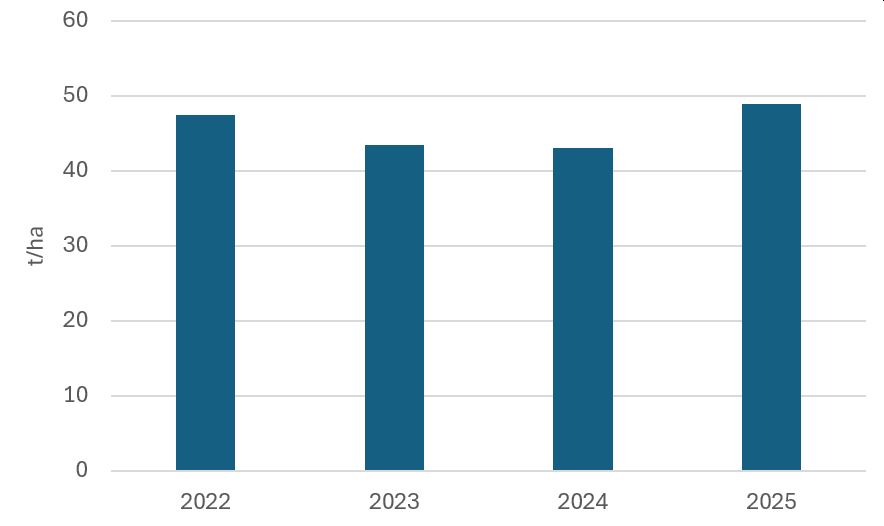 Rycina 10. Plony ziemniaków (wzorzec dla odmian średniowczesnych i średniopóźnych) w latach 2022 – 2025. Opracowano na podstawie danych COBORU (2025), t/ha
