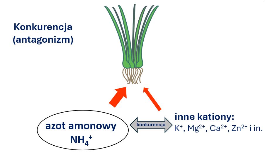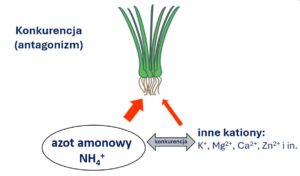 Rośliny uprawne pobierają azot w dwóch formach: NH4+ i NO3–. Akumulacja pierwiastków jest powiązana z formą azotu w nawozie. Forma amonowa sprzyja pobieraniu anionów stanowiąc jednocześnie konkurencję dla kationów („+”), natomiast azot azotanowy promuje przyswajanie jonów obdarzonych znakiem dodatnim (synergizm) – ryc. 2. Była o tym mowa pod koniec lutego.