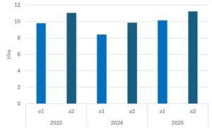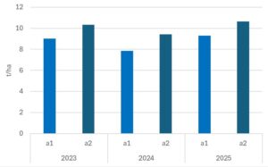 Rycina 4. Plony jęczmienia ozimego (wzorzec) w latach 2023 – 2025, zależnie od poziomu agrotechniki. Legenda: a1 – przeciętny poziom agrotechniki; a2 – wysoki poziom agrotechniki (zwiększone nawożenie azotowe, dolistne preparaty wieloskładnikowe, ochrona przed wyleganiem i chorobami) – opracowano na podstawie danych COBORU (2025), t/ha