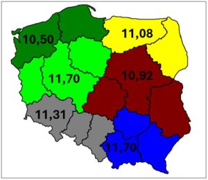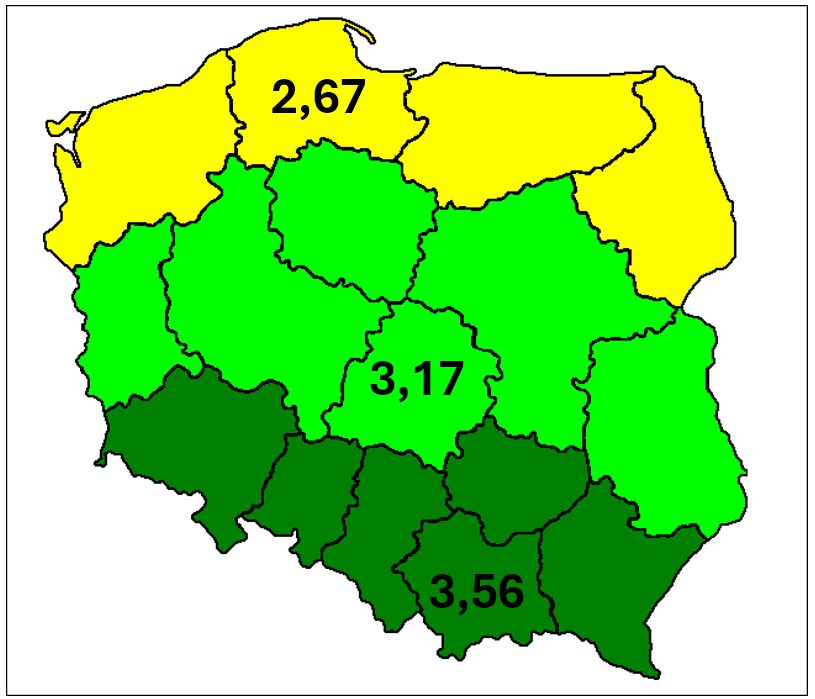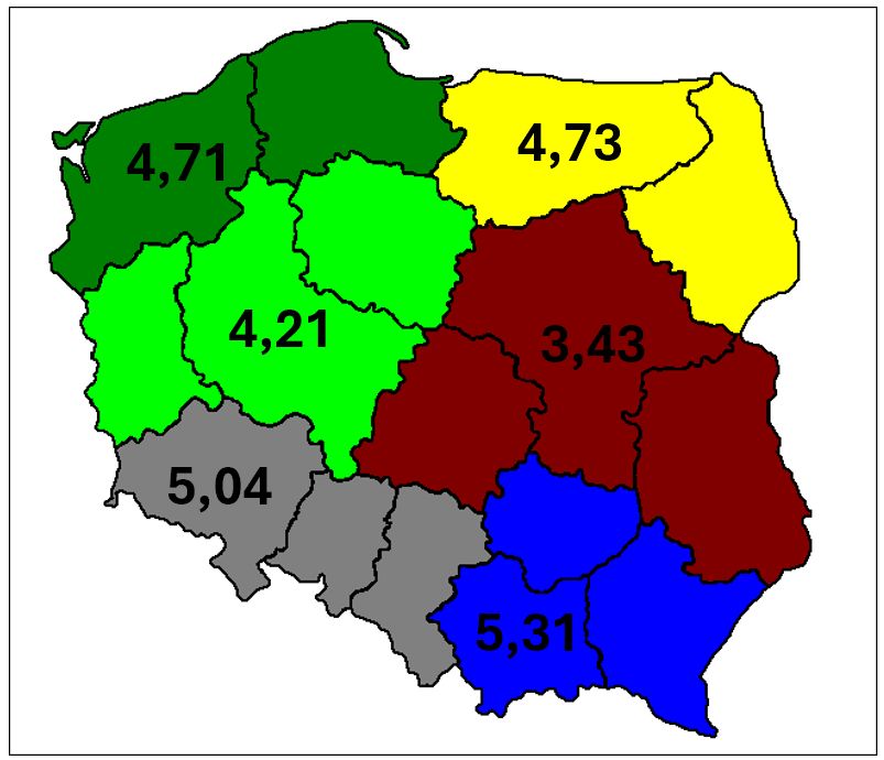 Rycina 6. Plony rzepaku ozimego (wzorzec) w poszczególnych regionach (ten sam kolor na mapie oznacza dany region) – opracowano na podstawie danych COBORU (2025), t/ha