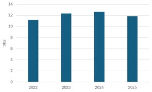 Rycina 7. Plony kukurydzy na ziarno (wzorzec dla odmian średniowczesnych) w latach 2022 – 2025. Opracowano na podstawie danych COBORU (2025), t/ha