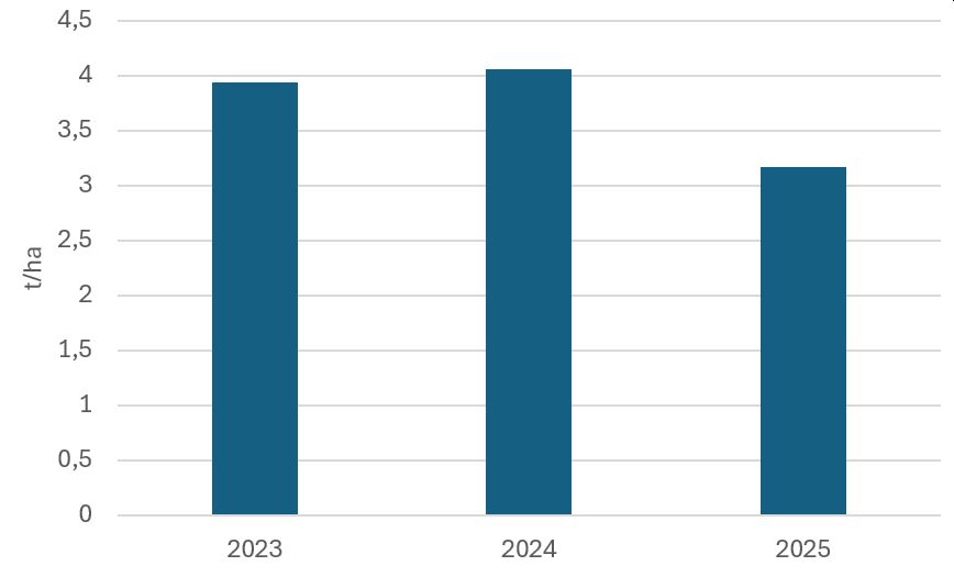 Rycina 8. Plony soi (wzorzec dla odmian średniowczesnych i średniopóźnych) w latach 2023 – 2025. Opracowano na podstawie danych COBORU (2025), t/ha