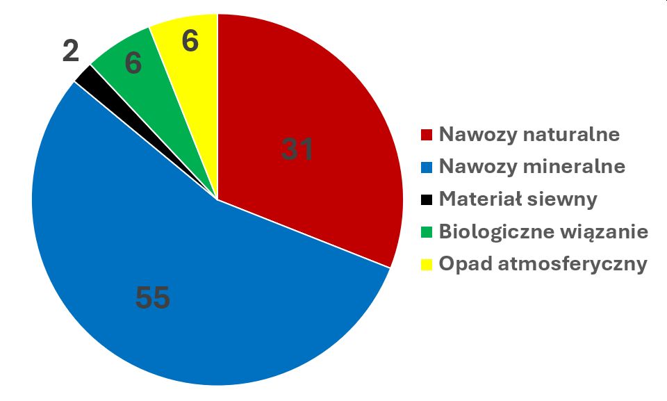 Uśredniony udział przychodowych źródeł azotu w bilansowaniu tego składnika przedstawia się jak poniżej (ryc. 1). Warto zauważyć, że są to zewnętrzne źródła, w których nie uwzględniono nie tylko zasobów glebowych, lecz także przychodu z resztek roślinnych i plonu pobocznego (o ile taki pozostaje na polu).