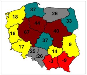 Salda bilansowe w poszczególnych województwach (ryc. 2) wykazują dość duże zróżnicowanie, co wynika z poziomu uzyskiwanych plonów, które z kolei są powiązane z inwestowaniem w środki produkcji, a takimi są nawozy. Oczywistym czynnikiem determinującym wielkość zbiorów są także stresy abiotyczne wynikające z warunków pogodowych i glebowych na danym obszarze. Według GUS średnie saldo bilansowe azotu w Polsce wynosi dokładnie 30,4 kg N/ha. W świetle literatury jest to wartość akceptowalna (także środowiskowo), ze względu na straty azotu, które należy ograniczać, lecz nie jest możliwe całkowite ich wyeliminowanie. Dlatego preferowana jest niewielka nadwyżka.