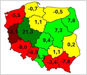 W przypadku fosforu w wielu regionach kraju pojawiają się ujemne salda bilansowe. Jest to efekt większego wyniesienia składnika z plonami w stosunku do ilości wnoszonych z nawozami. Taka sytuacja występuje między innymi na Dolnym Śląsku, ale także w województwie zachodniopomorskim i na Podkarpaciu (ryc. 3). Zwraca uwagę wysokie, dodatnie saldo bilansowe w Wielkopolsce. Mimo, że nawozy naturalne zawierają dużo mniej fosforu niż azotu i potasu, to duże pogłowie bydła i trzody chlewnej powoduje znaczną podaż tego składnika. Poziom notowany w Wielkopolsce (21,3 P2O5/ha), ze względu na podatność anionów fosforanowych na uwstecznianie, stanowi absolutne minimum w rozważaniach nad relacjami przychód/rozchód fosforu.