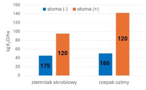 Na rycinie 4 zamieszczono dane pochodzące z gospodarstwa, w którym dokonano oceny sald bilansowych dla ziemniaków skrobiowych plonujących powyżej średniej krajowej i rzepaku ozimego, w dwóch systemach (opartym tylko o nawozy mineralne oraz w sytuacji gdy pozostawiono na polu słomę pszenną). Jak pokazują zamieszczone dane, w systemie mieszanym (słoma na polu) dawki potasu w formie nawozów mineralnych okazały się zbyt duże w stosunku do uzyskanych efektów (ryc. 4). Badania wykonano w glebie średniozasobnej. Gdyby było to stanowisko deficytowe (a takie dominują w Polsce) dodatnie salda bilansowe przy łącznym stosowaniu nawozów mineralnych i słomy byłyby w pełni uzasadnione.